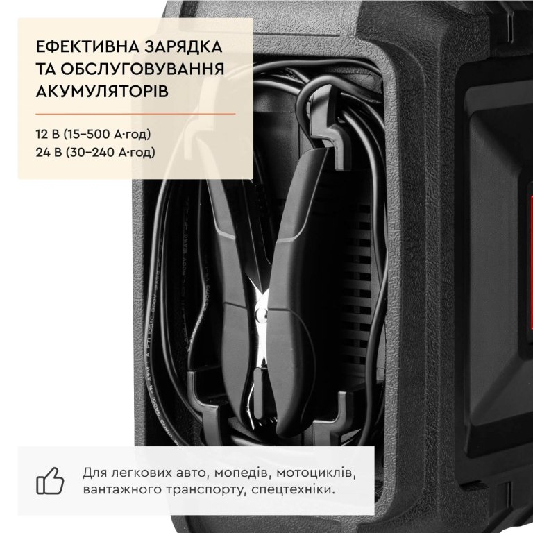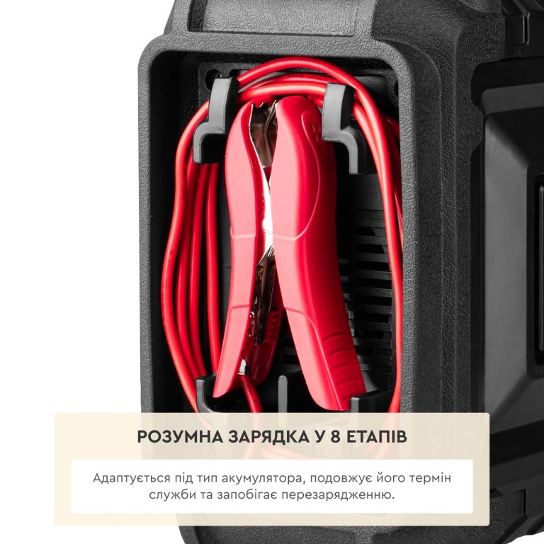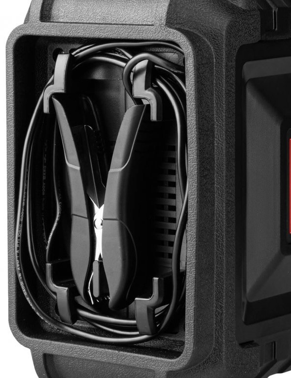 Инженеры Дніпро-М продумали конструкцию до мелочей. Корпус имеет специальные ниши для хранения проводов, поэтому вам не придется распутывать "клубок" кабелей перед каждым использованием. Резиновые бамперы защищают устройство от ударов в гараже. Процесс зарядки контролируется микропроцессором в 8 этапов, что гарантирует бережное отношение ко всем типам свинцово-кислотных батарей (WET, EFB, AGM, GEL).