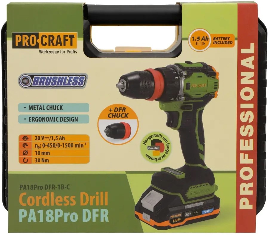Аккумуляторный шуруповерт Pro-Craft РА-18 PRO DFR — мощный инструмент с напряжением 18 В, предназначенный для сложных задач сверления и завинчивания. Благодаря **бесщеточному двигателю** он обеспечивает высокий максимальный крутящий момент 30 Нм, что делает его эффективным для работы с твердыми материалами. Ключевым преимуществом является наличие съемного патрона (система DFR), который позволяет мгновенно переходить от сверления к завинчиванию, используя биту непосредственно в шпинделе. Шуруповерт имеет две скорости работы (до 450 и до 1500 об/мин) и функцию плавного пуска, что обеспечивает точный контроль над работой. Эта модель подходит для сверления дерева (до 20 мм) и стали (до 10 мм).