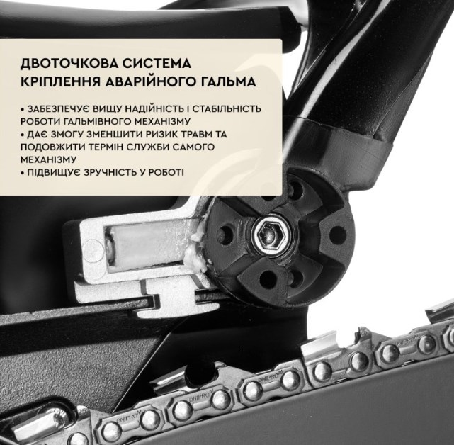 - ✅ Безопасность и комфорт: Эффективный тормоз цепи, а также антивибрационная система для снижения нагрузки на оператора.