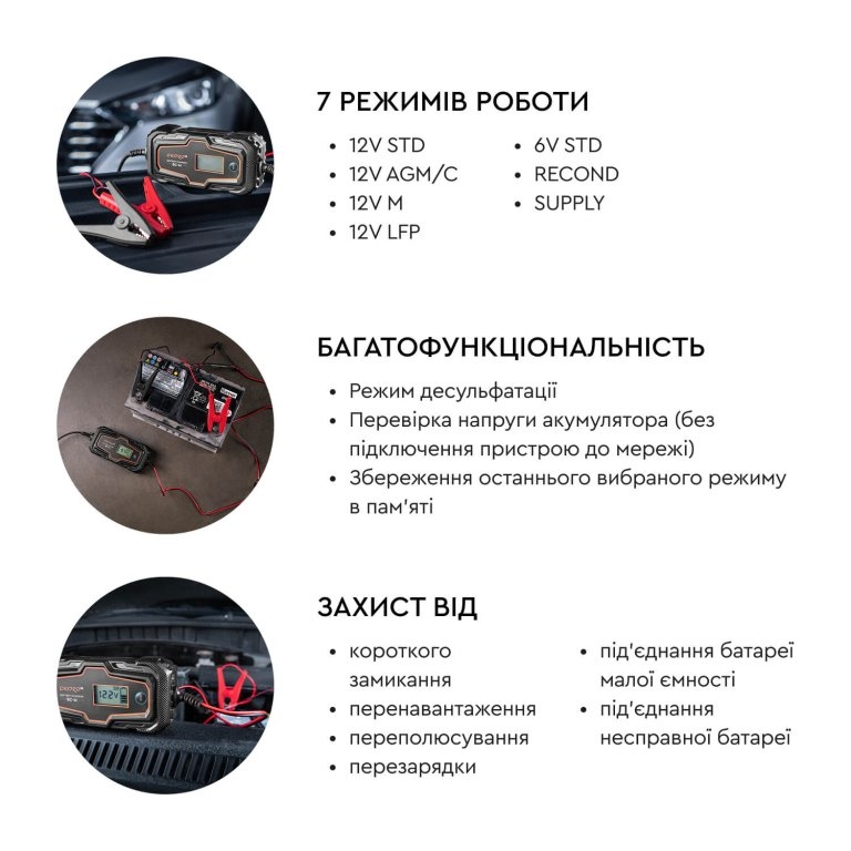 - ✅ Функціонал: Режими відновлення (десульфатація) та живлення бортової мережі (Supply).
