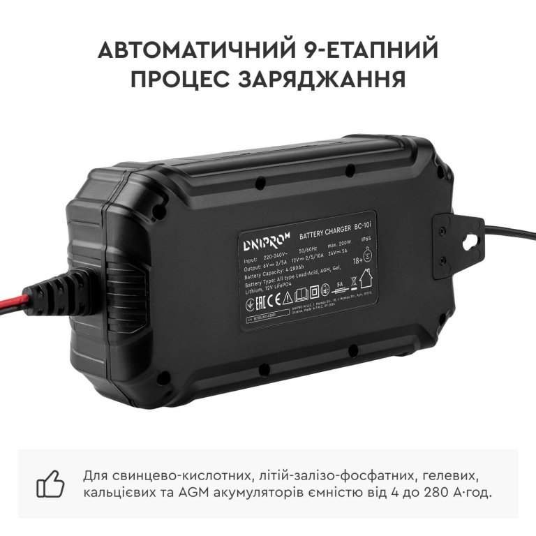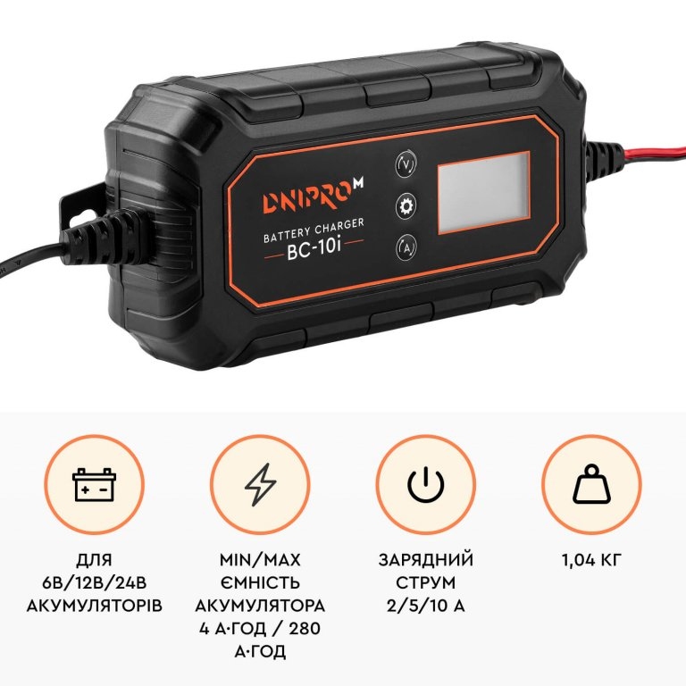 Интеллектуальное зарядное устройство Дніпро-M BC-10i — это флагманская модель, созданная для полного контроля над энергией вашего автопарка. Если у вас есть и мотоцикл (6В), и легковой автомобиль (12В), и грузовик или комбайн (24В), этот универсальный аппарат заменит собой три разные зарядки. Он способен обслуживать аккумуляторы гигантской емкости — от 4 до 280 А·ч, заряжая "сотку" с нуля менее чем за 9 часов.