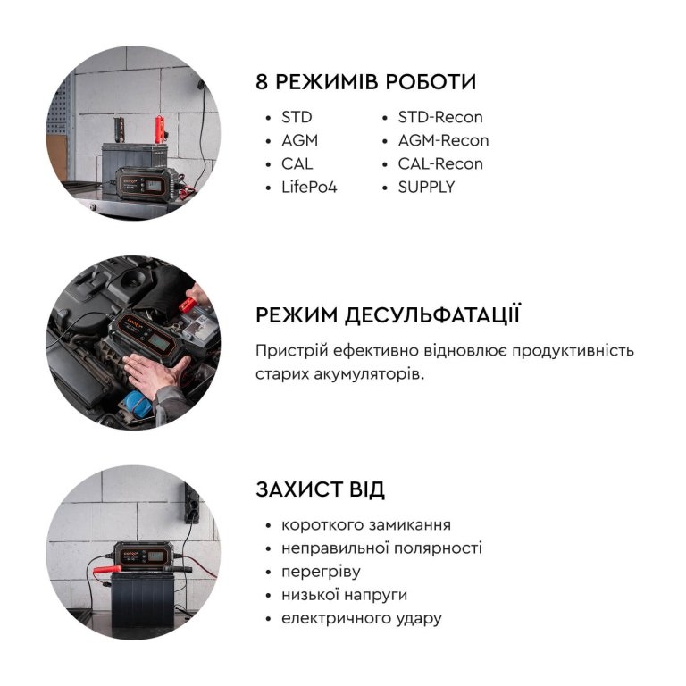 - ✅ Три режима RECON: В отличие от простых зарядок, здесь есть отдельные программы восстановления для свинцовых (STD-Recon), AGM (AGM-Recon) и кальциевых (CAL-Recon) батарей. Это позволяет "поднять" даже глубоко разряженные источники питания.